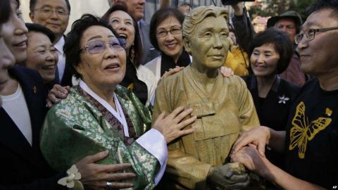 22日下午,美国旧金山圣玛丽广场,身穿韩国民族服装、89岁的慰安妇幸存者李荣洙(Yong-soo Lee)轻抚着刚揭幕的青铜雕像慰安妇少女的裸足,喃喃自语,眼泪滑下她的面庞。